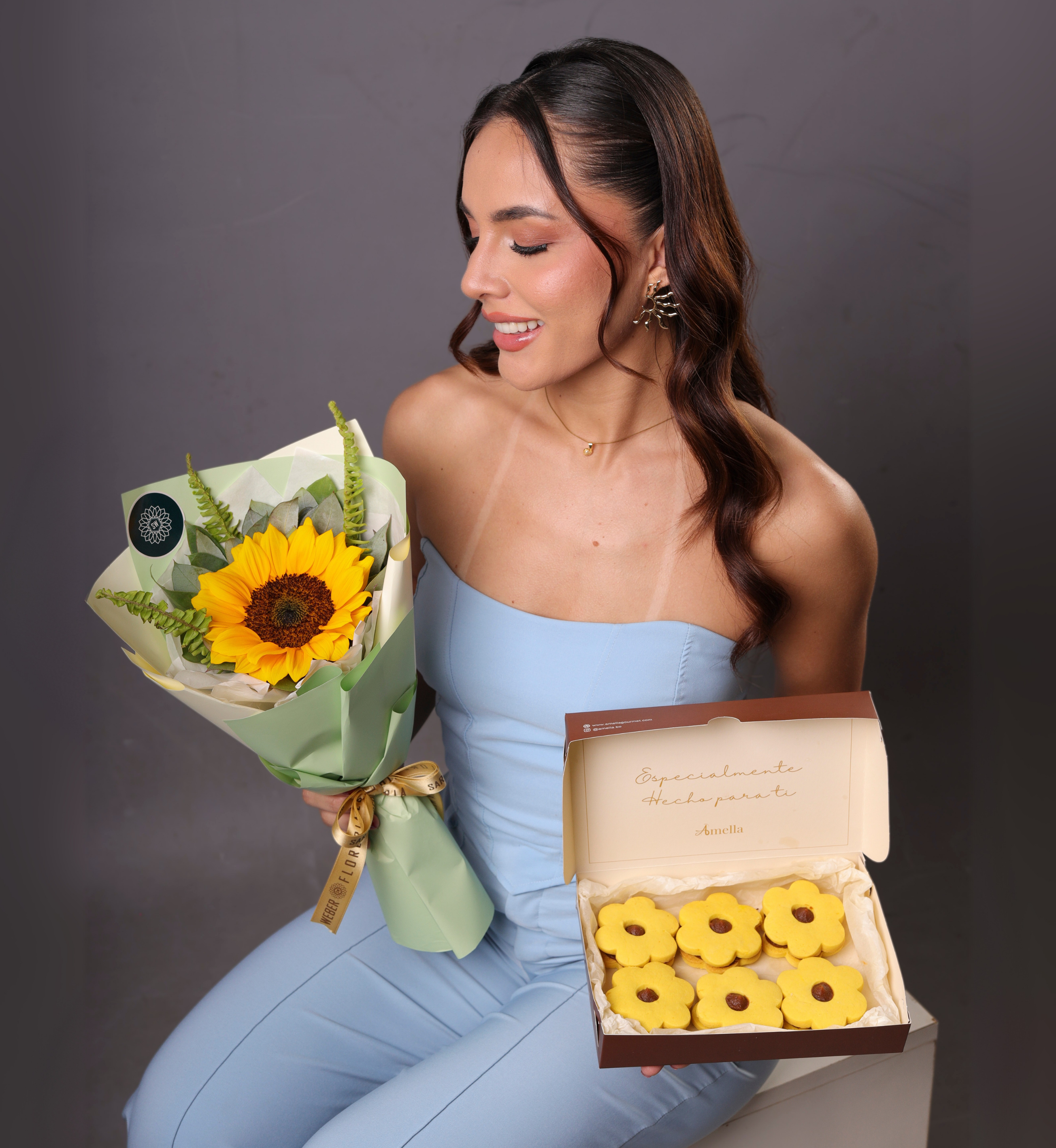 Ramo de 1 Giraso y caja de 6 alfajores de maicena artensales Amella. Producto Exclusivo de Floreria Sara Weber. Entregas en Santa Cruz de la Sierra, Bolivia.