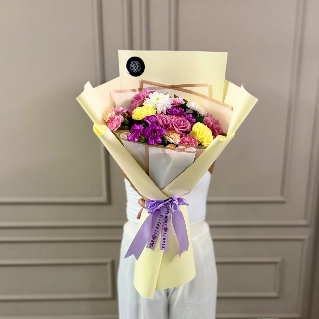 Ramo con clavelines, lisianthus y crisantemo. Producto Exclusivo de Floreria Sara Weber. Entregas en Santa Cruz de la Sierra, Bolivia.