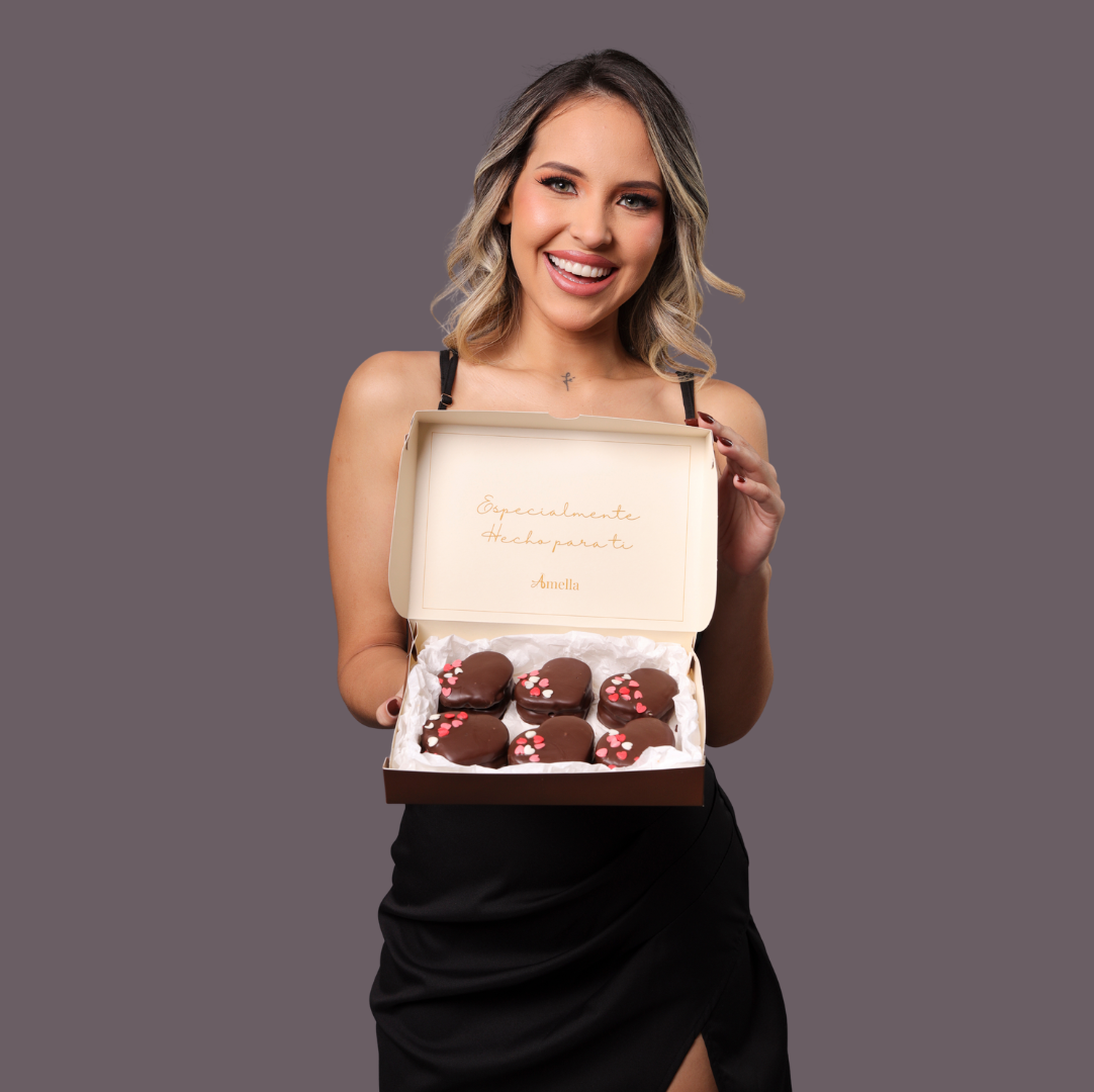 Pack de 6 alfajores en forma de corazon y una rosa decorada. Producto Exclusivo de Floreria Sara Weber. Entregas en Santa Cruz de la Sierra, Bolivia.