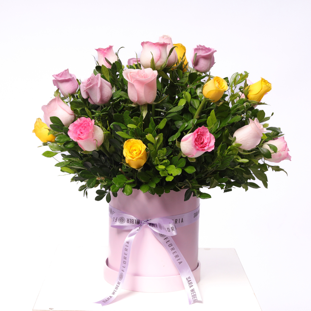 caja redonda con rosas. Producto Exclusivo de Floreria Sara Weber. Entregas en Santa Cruz de la Sierra, Bolivia.