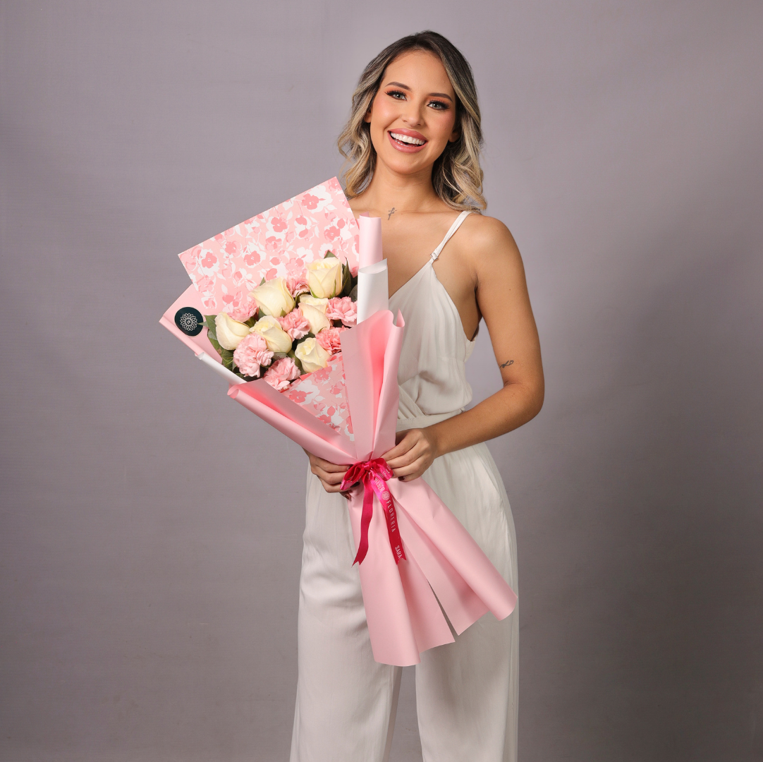 Ramo de 6 rosas blancas y claveles. Producto Exclusivo de Floreria Sara Weber. Entregas en Santa Cruz de la Sierra, Bolivia.