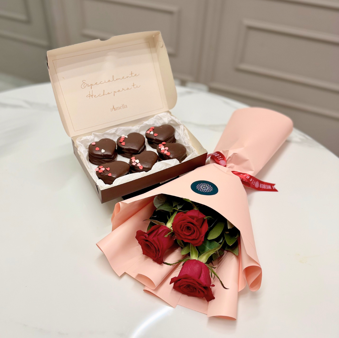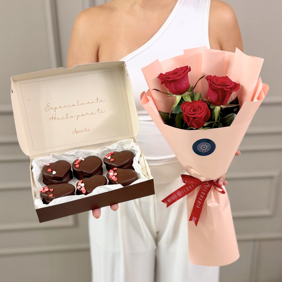 Pack amor, Ramo de rosas y caa de 6 alfajores en forma de corazon. Producto Exclusivo de Floreria Sara Weber. Entregas en Santa Cruz de la Sierra, Bolivia.